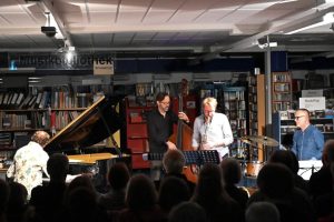 So viel Prominenz auf einmal in der ausverkauften Musikbücherei: Carsten Hillgruber, 1. Stadtrat u.a. für Kultur, Wolfgang Röttgers, Leiter des Kulturforums Schleswig-Holstein e. V. und schließlich als Vertreter der Kulturschaffenden der Saxofonist/Professor an der Hochschule für Musik und Theater Hamburg und Mitglied der NDR-Bigband Fiete Felsch: Er war gekommen, die Laudatio für den diesjährigen Preisträger des Schleswig-Holsteinischen Jazzförderpreises zu halten und hob die Spielfreude und technische Reife des diesjährigen Gewinners Ben Prechtl am Saxofon hervor.