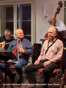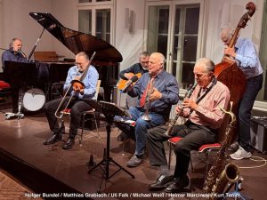 In klassischer Besetzung boten die „Heißen Sechs“ ein umfassendes Programm von Standards wie „Bourbon Street Parade“, „Bei mir bist du schön“, über „Everybody loves Saturday Night“ bis zu „Honeysuckle Rose“, „At the Jazz Band Ball“ und „Icecream“. Sie waren nicht verlegen, auch ein drittes Set zu spielen und dabei auch spontan Publikumswünsche wie „Petite Fleur“, „Dr. Jazz“, „Down by the Riverside“ oder „Sheik of Araby“ zu berücksichtigen. Nebenbei konnte man erfahren, dass der Kern der „Hot Six“ seit über 40 Jahren in Sachen Dixieland auf den Bühnen steht. Viele Besucher verließen sehr beschwingt den Saal. Es scheint, der Jazz-Club Neumünster e.V. hat eine neue Spielstätte gefunden.